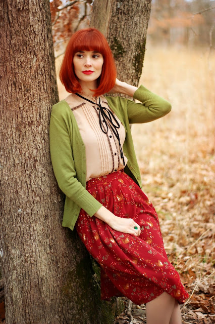 Shopping Info: Squirrel Away Skirt in Red from Princess Highway, With Haute a Doubt Heels and Charter School Cardigan in Sage from ModCloth, Forever 21 Blouse from ThredUp. Use my link to sign up and save $10 off your first order, Ring is handmade by me and available for purchase for $12 (includes shipping). Just use the contact me link for more info.