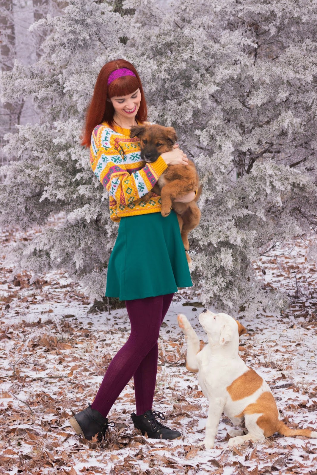 You looks damn pretty in this classy bright yellow sweater. I am very fond of vintage dresses especially the 1950s clothing. And how could to forget the cute puppies. so adorable and joyful holidays.