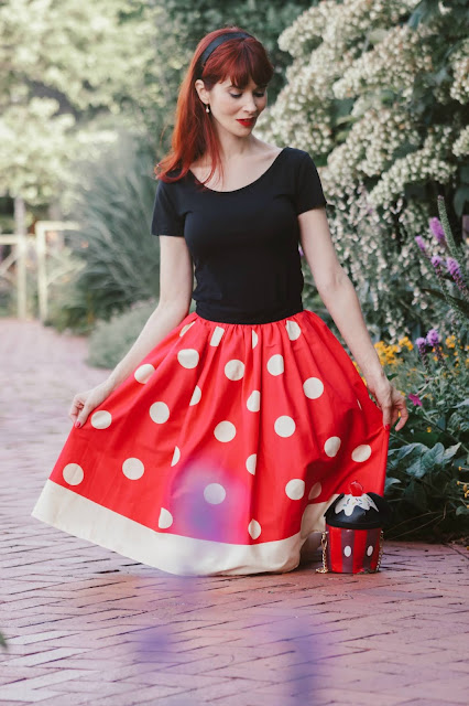 My outfit today is a perfect example of Disneybounding. The skirt, top and purse are inspired by Minnie Mouse, but not a direct Minnie costume. There are rules against costumes and I think the rules are for a good reason. Disney expects their employees to behave in a certain way while in character and they don't want that to be confused with a park-goer in costume who is cranky, rude, etc. Seems pretty reasonable to help preserve the magic, right?