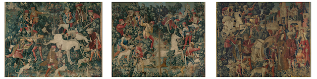 To paraphrase Freud, sometimes a tapestry is just a tapestry. My interpretation is that we should take this drapery drama at face value; it's just the story of a unicorn being captured and killed. The End. They're beautiful works of art by supremely skilled craftsmen telling the tragic tale of a mythical creature destroyed by human greed, but filled with symbolism? No, probably not.