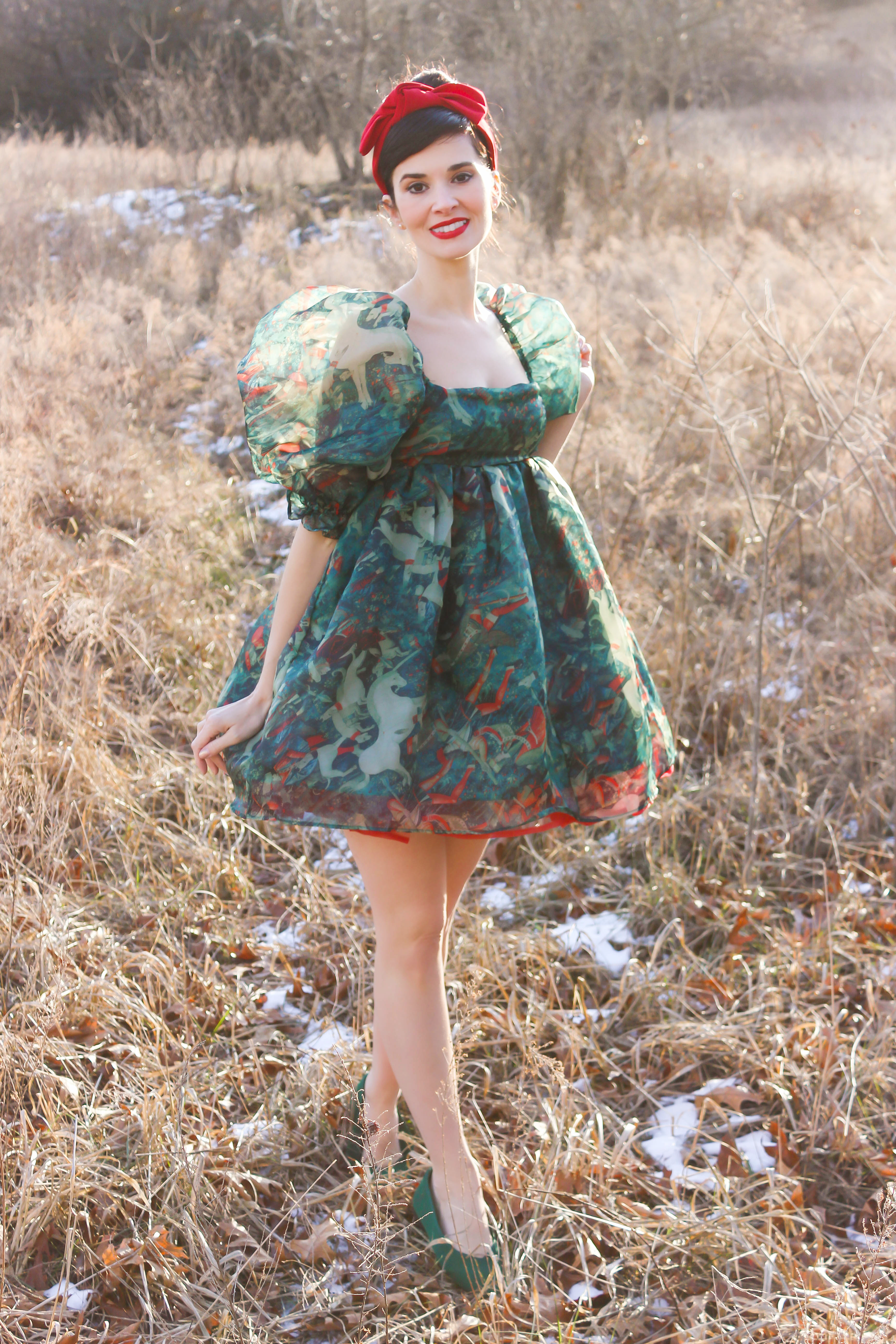 It's so interesting to me how I wear this dress throughout the year and it's just a regular green dress, but add a red petticoat and some red accessories and suddenly all the reds in the print standout and it's the perfect unconventional holiday dress.