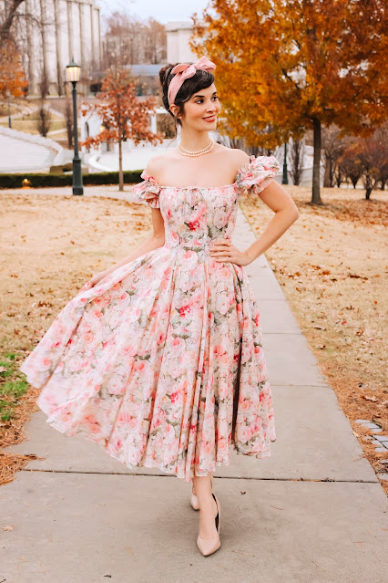 If you've never seen the old MTV Cribs episode where they tour Pamela Anderson's home, I'll link it here so you can see what my dream house looks like. It is stunning! It's full of all my design favorites including: floral chandeliers, pink depression glass, clapboard walls, and wicker furniture. I love it all and I'm working on building my dream home just now, which includes many of those same elements. I'd love to do a tour one day when it's finished, but for the moment, I thought I'd share this Pam Anderson inspired Selkie dress, aptly titled, The Pammy. The print is devine and really does seem to be inspired by her 90s home. I've had my eye on it since its release and promised myself that if it were part of the Black Friday sale I would go for it. I intend to do far less buying in this new year, but I have no regrets about getting this piece while I could. The icing on this cake was that I got to stack a promo code on top of the sale, so it was even better.